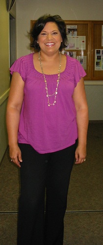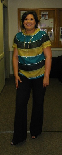 Magenta ruffle-sleeve t-shirt (Elle Must Have T style EL11064, color 500 Byzantium, Kohls $26 on sale for $12), long necklaces (Harwin St., $3 each), Black Magic pants (Gap, $50), Cole Haan platform pumps (Macy’s, $250)
