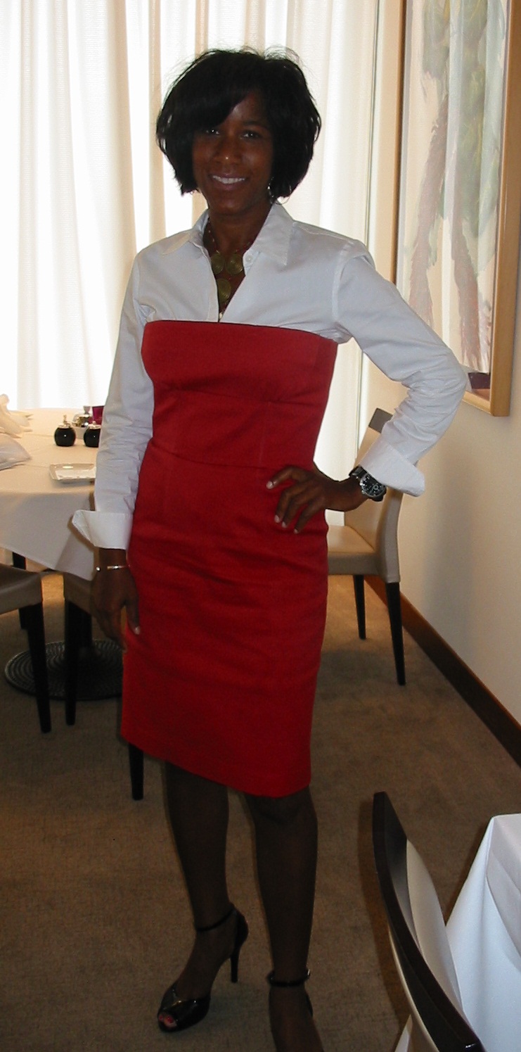 Runways and stores are full of strapless dress this season. Lots of women are hesitant to wear them for fear of falling out or appearing unprofessional. Here’s an all-business twist to solve both challenges…Joy Sewing (Fashion and Beauty Editor at the Houston Chronicle) was spotted this morning wearing her brilliant combination of white button-down blouse under a tailored strapless dress.